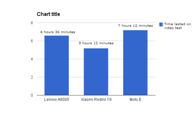 Ini adalah bagian dimana A6000 cukup mengecewakan. Pada uji baterai, kualitas baterai dari ponsel ini di belakang Moto E, tetapi lebih baik dari pada Redi 1S.