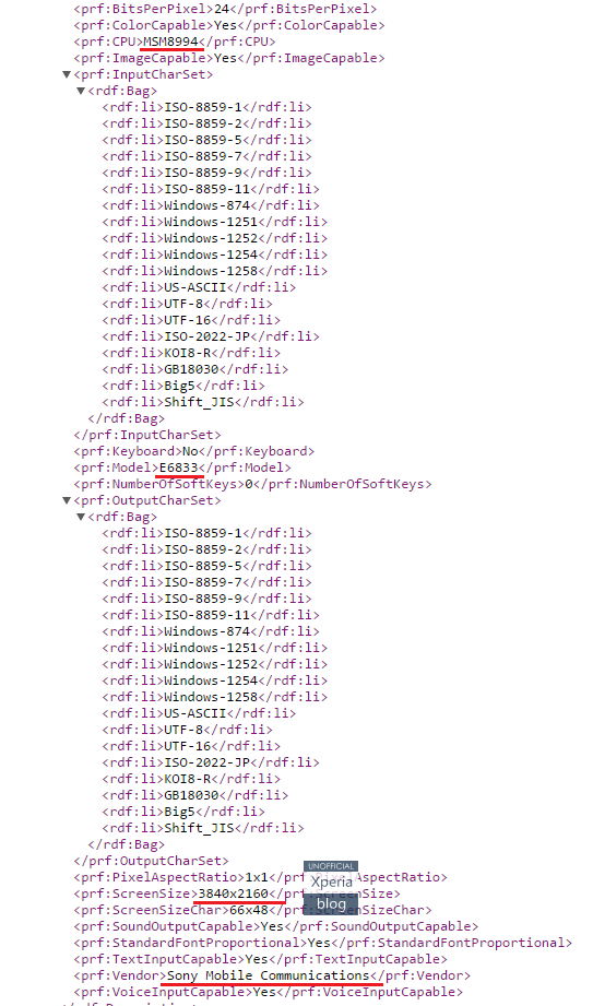 Berdasarkan User-Agent Profile, ada sebuah kode dengan nama Sony E68X yang belum dipublikasikan, dengan varian berkode E6833, E6853, dan E6883, yang diidentifikasi memiliki layar dengan resolusi 2160 x 3840 piksel. Kami menduga varian tersebut adalah phablet dengan ukuran layar minimal 5,5 inci yang cukup besar untuk layar sebuah smartphone. Beberapa anggota Blog Xperia juga menyebutkan bahwa layar 4K tersebut dapat memiliki tingkat densitas 801 ppi, jauh lebih tinggi daripada layar lainnya.